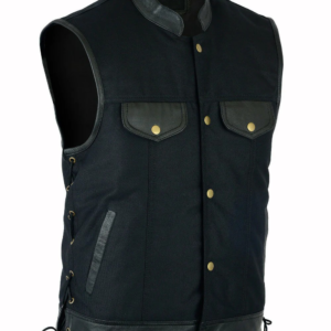 Mens Side Lace Biker Style Vest Leather Trim & Black Denim
